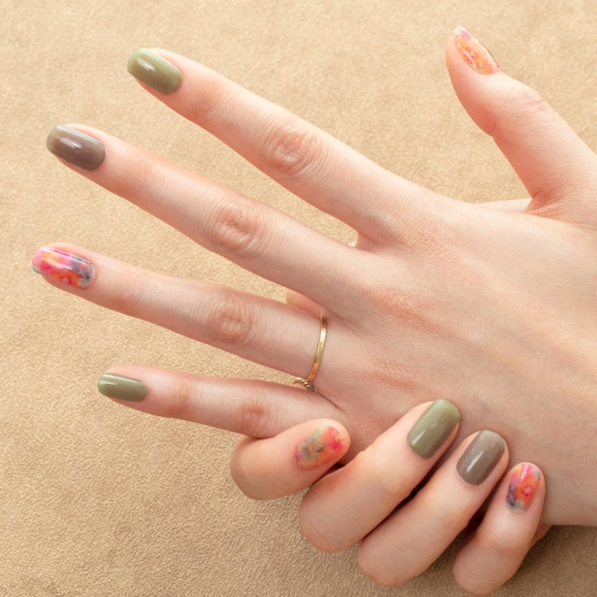 フラワータイダイ2本に、残りは濃淡のカーキをランダムに組み合わせて。