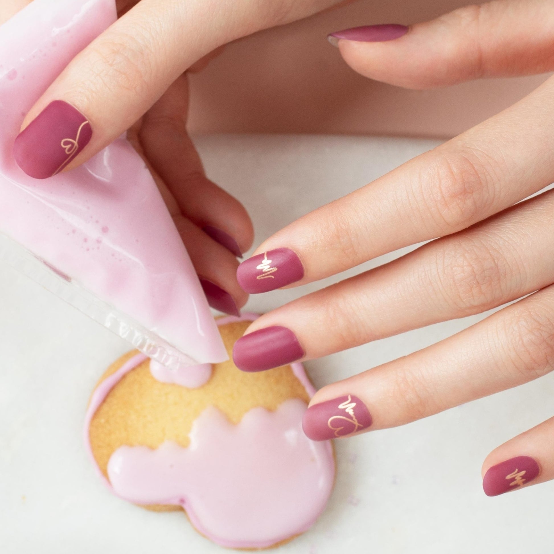 甘いピンクはくすみニュアンスのマット質感で肌なじみが抜群。年齢問わず楽しめるちょっぴりラブリーで上品なネイルに仕立てます。
