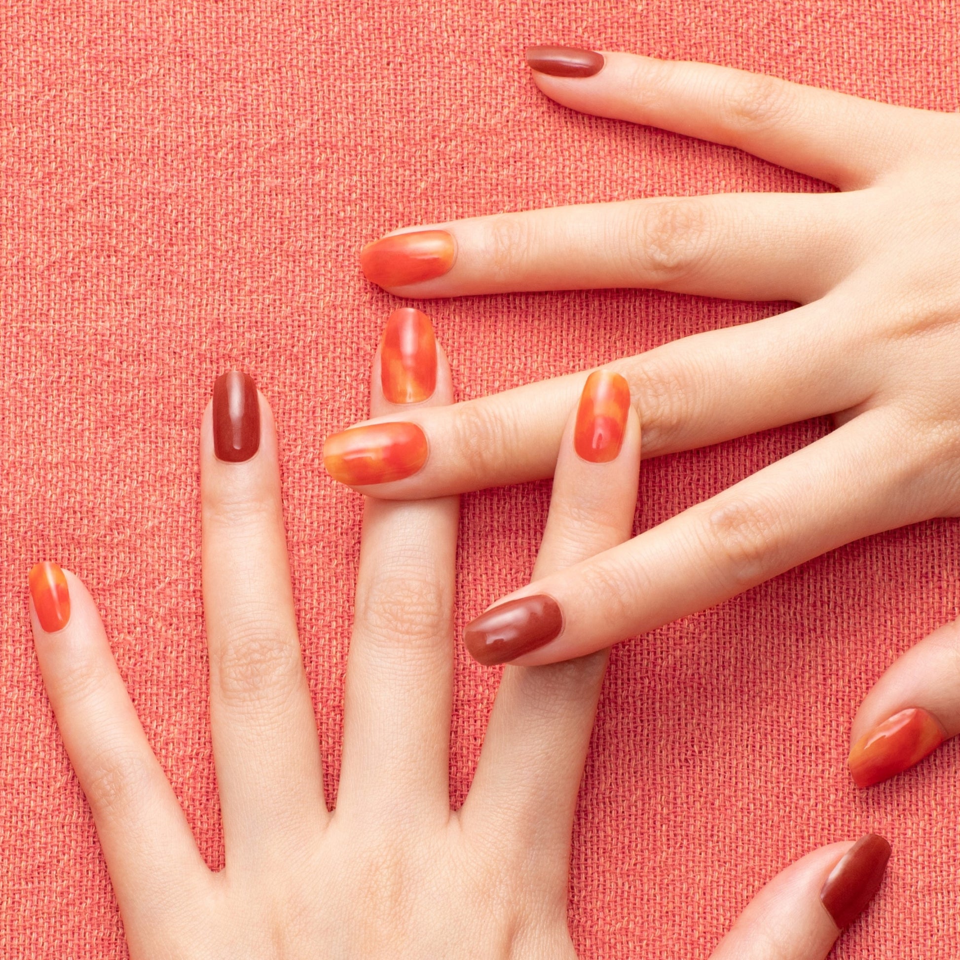 オレンジタイダイ、テラコッタブラウン、どちらもメインになるカラーであり、日焼けした肌から明るいトーンの肌まで肌の色を選ばずになじむのが魅力。左右の手で分けても、すべてを1デザインでまとめてもオシャレ。