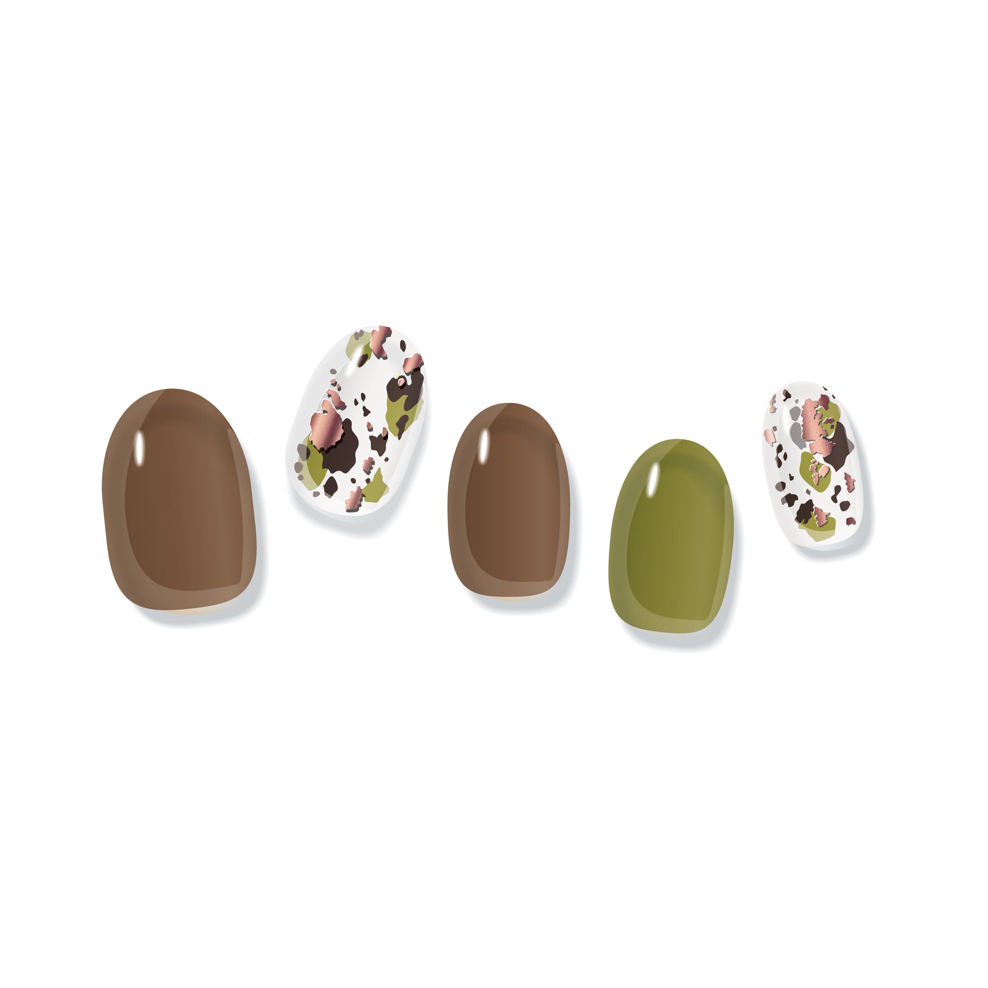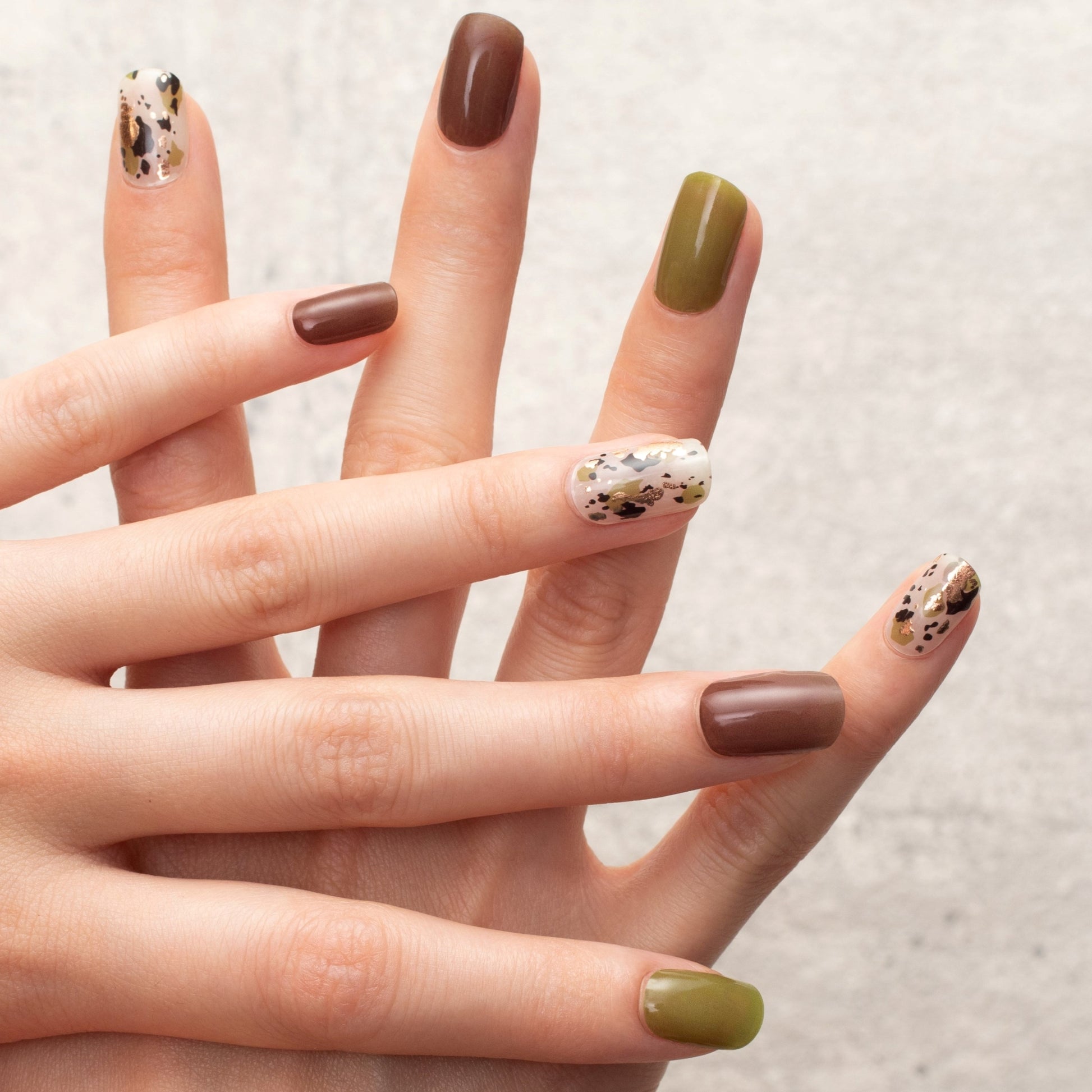 スモーキーな2色のワンカラーと、その2色にリンクしながらもランダムな柄とコッパーの輝きでインパクトを添えるアートデザインを合わせたセット。